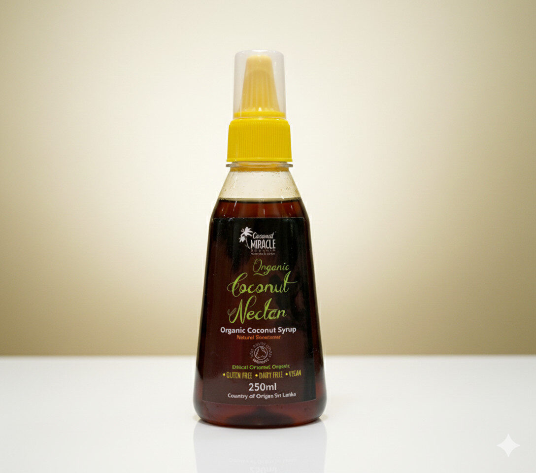 Coconut Miracle Organic Coconut Nectar is awesomely delicious light golden colour syrup as it has been gently crystallised making it a natural low GI mineral rich natural sweetener suitable for any age group. Healthy alternative in beverages, food, desserts or baked goods It is a healthy alternative over cereals, porridge or yogurt. Pour over ice-cream …simply yummy It has a very low melting temperature with an extremely high burn temperature, making it perfect for confectionery and various baked foods. No sulphates, No chemicals, No colourings, No preservatives, No stabilisers, No flavourings, No GM ingredients, No cholesterol, No cane sugar, No palm sugar, No soya, No grain, No gluten, No dairy, No yeast. Suitable for vegetarians and vegans. Delicious Natural Nectar – Try it once!!