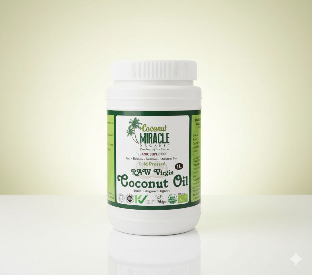 Coconut Miracle’s NEW 1L food grade plastic giant tub of raw organic cold pressed virgin coconut oil. More oil for your spend!!.